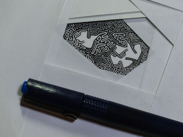 夜間の制作中は部屋の照明とライトの明かりを頼りにするものの、作品のサイズが大きく、自分自身が作業机の周りを動き回りながら体ごと画面に覆いかぶさって描き込むので手元が影になりやすく、自分が描いている線がはっきりと見えないことも多いです。 このような場合、何を見ながら迷路の線を描き進めていくのかというと、線の部分と余白部分のコントラストの差を見ながら描き進めています。